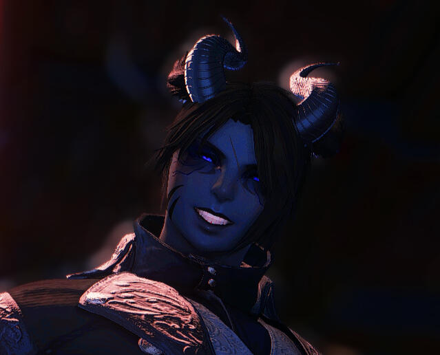 APPEARANCE From the darkness, chilling icy blue eyes bore into your very being, an animalistic need emanating from it. Like a predator watching its prey. Its face surprises many; that of a mortal miqo’te, though with more structure. Many miqo’te features can be found on the beast; cat ears that wiggle with certain actions, slitted eyes, a tail which had been covered by scales, and cat-like mannerisms which it rarely shows. Speculation suggests their old mortal self was a miqo’te, but they can no longer remember if this is true.At the top of its head are large horns that curve in near the tips. A crown befitting a lord. Their hair, a messy muted gray-blue, their bangs sitting gently on their face. The rest trailing down to their shoulders. It’s surprisingly soft to the touch.When they smile, the sight of their sharp teeth and extra long fangs strike fear into most men. That is, until the tongue of the beast slowly slips out from between the teeth, the length of it extending far past a normal mortal’s. It sends shivers down most spines. Pierced through it is a little gold piercing. Several of these piercings can be found on their body besides the tongue; specifically the nipples and genitals.The scales that cover most of its body catch the eyes instantly. Acting like makeshift armor, these scales are incredibly tough and near impenetrable, allowing the beast to take attacks from all different weapons with ease. Certain sections, notably on the arms, legs, and tail, are able to flare up and protrude away from the body, imitating spikes. A blue glow can be seen from underneath. All of it crowned by the large spikes that shoot up from their shoulders. Their fingers and toes are also completely covered by scales, some coming to a point to create extremely sharp claws for them. A special scale plating covers their crotch, their genitals present underneath it.The wings on their back fit their lord stature as they drape down like a tattered cape with its bottom edges torn and shaped in a more regal nature. Being a male variant of the greater succubi voidsents, their wings are shaped in a similar fashion, starting from their lower shoulder blades and the joints bending near the bottom of the wing arms. This joint can fold up when the wings are moved inward as a way of folding in the wings as a whole.The touch of their skin is a gamble. Due to their special aether combination, their skin will simultaneously feel both hot and cold, seemingly coming in waves. This allows them to survive in very hot or cold weather without assistance.While traveling on the Source, they wear armor that covers their whole body to hide their true form.